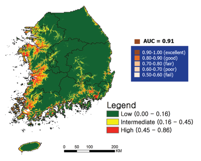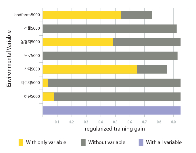 결과적으로 산지의 면적과 특정 지형분류의 면적은 황새의 분포를 예측하는데 가장 기여도가 크고 중요한 환경적 요인으로 산출되었다. 잭나이프 검정(Jackknife Test)에서도 “ 산지의 면적” 변수로도 높은 정확성으로 예측할 수 있으며, “ 지형분류의 면적” 변수를 제외하였을 때 그 정확성은 현저히 감소하는 것으로 나타났다.