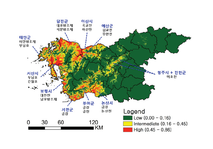 정보이론(Information Theory)은 부분적인 정보를 바탕으로 확률 분포를 설립하기 위한 기준을 제공한다. 이를 통해 누락된 정보로 알지 못하는 영역을 최소화 하고, 제공된 정보를 최대한 활용하여 편견을 최소화할 수 있다. 이러한 원리를 활용한 통계학적 추론(Statistical Inference)을 최대엔트로피(Maximum Entropy) 예측이라고 하며, 최근 기존 통계학적으로 통제가 어려운 환경적 변수를 다루는 경관 생태학(Landscape Ecology)에서 많이 사용하고 있다. 본 모델링에 사용된 프로그램은 최대엔트로피 이론을 활용하여 특정 종의 분포를 예측할 수 있는 소프트웨어 Maxent(버전 3.3.3k)를 사용하였다. Maxent 프로그램에 대상 종의 위치 자료와 위치 정보를 포함한 환경적 변수 레이어(지형분류, 산지, 농경지, 건물, 도로, 하천, 저수지)를 입력하여 분석하였다. Maxent 모델링의 결과는 수신자 조작 특성(ROC) 곡선을 통하여 그 적합성을 제시한다. ROC 곡선에서 모델링의 정확도는 AUC 값에 의해 측정된다. “AUC = 1.00”은 완벽한 검증을 나타내며, “AUC = 0.50”은 정확도의 검증 실패로 나타낸다. 최종적인 Maxent 모델링은 결과적으로 “AUC = 0.82”으로 양호한 수준으로 나타났다. 최종 Maxent 모델은 결과적으로 각각의 변수들의 상대적인 기여도를 다음과 분석하여 제시하고 있다. 모델에 사용된 7 개의 환경적 변수들을 제외와 삽입을 반복하며, AUC 값의 변화를 상대적으로 평가하여 변수들 각각의 기여도와 중요도를 분류한다.