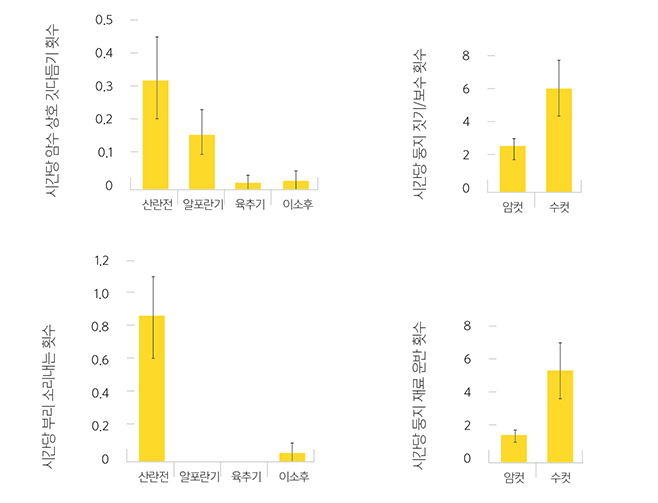 번식시기 별 황새의 행동 특성 변화. 산란 전에 암수는 상호 깃 다듬기 행동과 부리소리내기를 통해 짝 유대성을 강화한다(Yoon et al., 2015). 암컷과 수컷간 둥지 짓기나 보수에 쏟는 힘이 다르게 나타난다(Yoon et al., 2015).